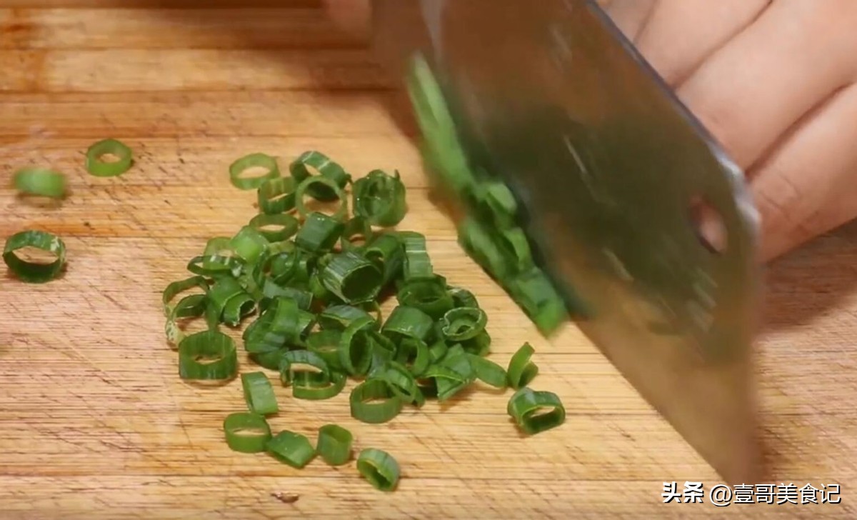 2.准备三根小葱,先放进清水中,将小葱整个清洗干净,然后捞出来晾干水。接着,把小葱放在案板上,用菜刀先把它们的根部切掉不要,再把剩下的部分切成细细的葱圈。切完之后,将葱花放进碗里,备用。