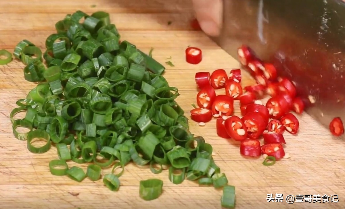 3.准备几个小米椒,先用清水将它们表面清洗一遍,然后晾干水。接着,把小米椒放在案板上,先用菜刀将它们的辣椒蒂都切掉不要,再把小米椒放整齐,切成辣椒圈。全部切好后,和葱花放在一起待用。