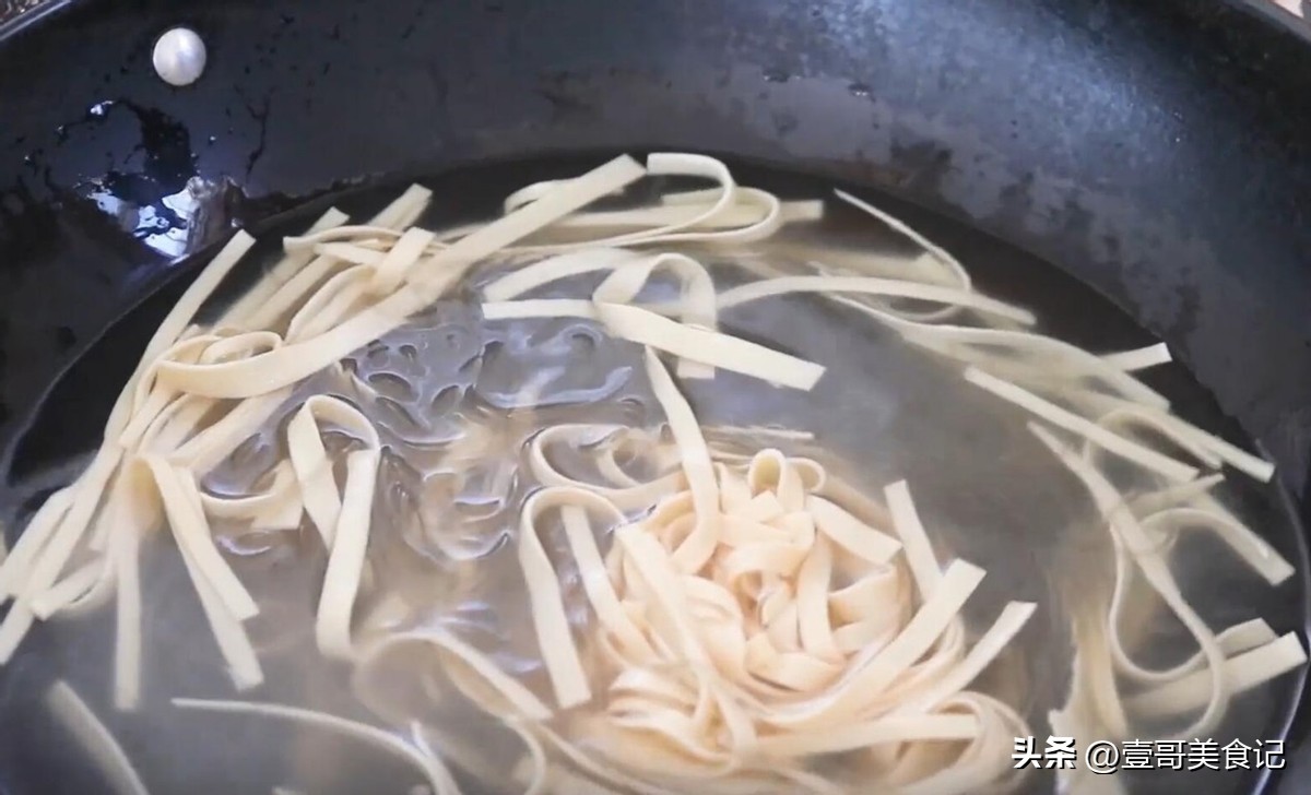 7.给炒锅里倒进去适量的清水,开大火烧水。等锅里的水烧开了,将泡好的粉条放进锅里,用筷子搅动它们,防止它们粘连和粘锅,也使它们受热均匀。等粉条煮了一分钟了,将豆腐皮也放进去一起煮。再煮1分钟,粉条和豆腐皮就熟了,可以关火了。