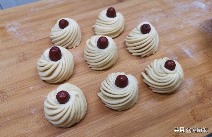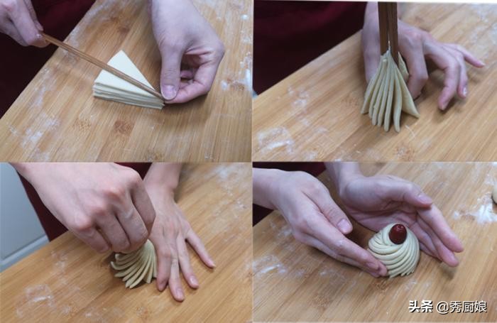 先给大家介绍一款像苹果一样漂亮的枣花馍。具体做法步骤如下:取一个小面剂,擀成3毫米左右的厚片,然后打米子刀,将圆面片分成大小均等的8份。把8份面片叠放在一起,用筷子在中间按压一下,然后把面竖起,用一双筷子使劲夹一下,用右手捏住顶端,轻轻旋转,使下边的裙摆成螺旋状。然后用手指将顶端按压一下,按上一个清洗干净的大枣,一个螺旋状的枣花馍馍胚就做好了。