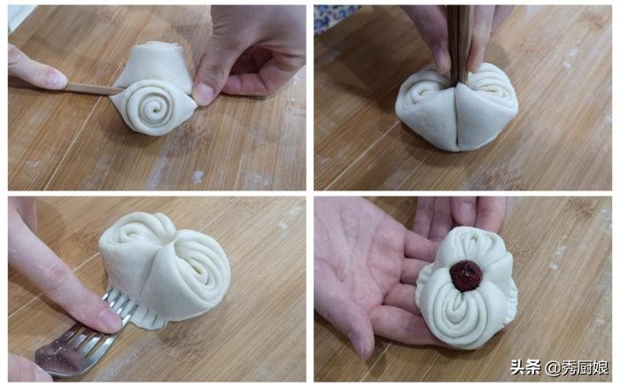 第四种做法:这是一款形似蝴蝶的枣花馍,非常的漂亮。取一个面剂按扁,用擀面杖擀薄,擀圆,刷一层油。用刀在中间对半切开,上面留2-3厘米,不要切断,再将两边分别卷起,向外折一下,使两个面圈对齐,用筷子在中间向里面夹紧,两边用筷子夹一下,上边再放一个清洗干净的大枣即可。