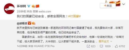 昨天夜里我与已被送到香港一家医院的环球网记者付国豪通了电话,我先要告诉大家,非常万幸的是,他没有受到很严重的伤害。他已经完全安全了。