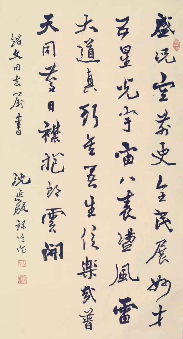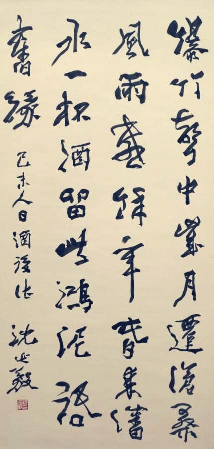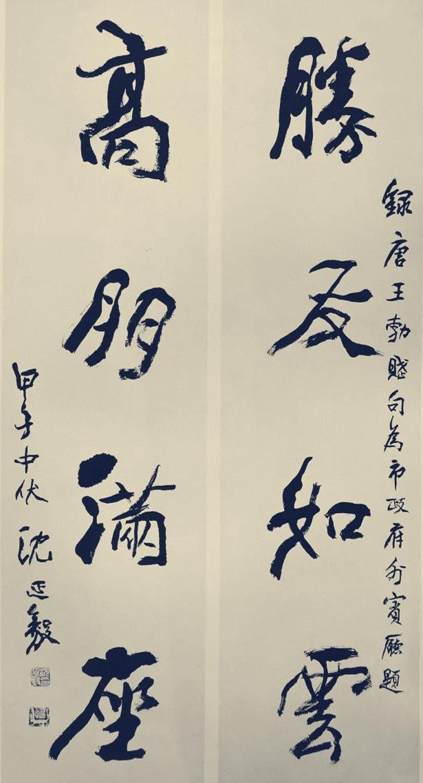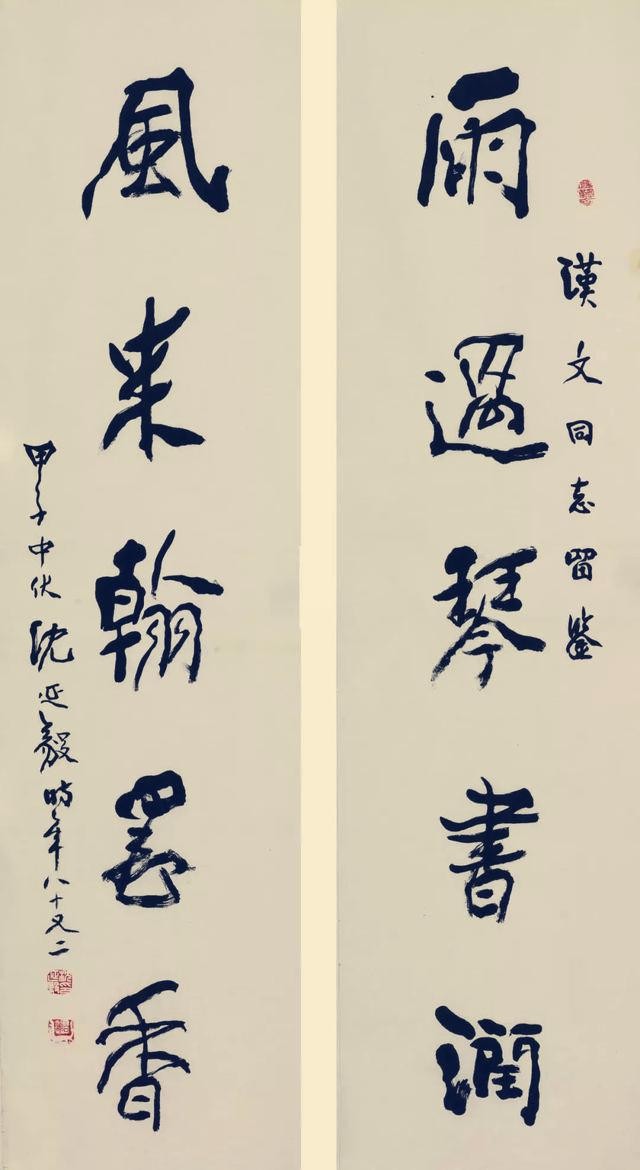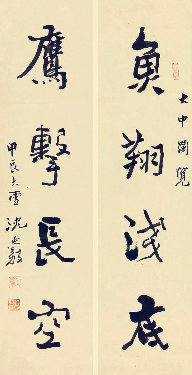 沈延毅的书法却是纯用方笔,很少用圆笔,行笔、结体反倒能够看出受沈曾植影响较深。沈延毅似乎对于碑学情结强烈,所以他的书法少见碑帖兼容,而是在保持碑派书法的严整气象下,加以夸张变形;用笔更是纯粹以写碑笔法为之。