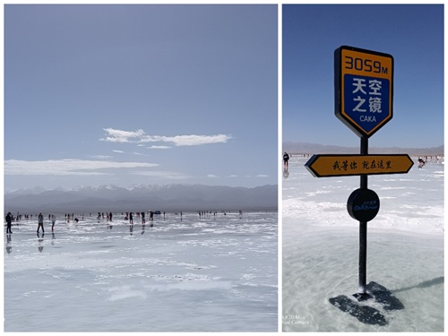 茶卡盐湖非常著名,这次得以游走其中。蔚蓝色的湖面波平如镜,倒映着天空的美景,故称中国天空之镜。穿上胶鞋,漫步浅浅的湖中,仿佛行进在白云间,透明的湖水上还有雪山的倒影。白色的雪山与云朵,蓝色的湖水与天空,游人红色的胶鞋与多彩的衣装,交相辉映,构成一幅绚丽的画图,人在画中,令人陶醉。在海拔3059米的“中国天空之镜”标志前留下倩影,“江山秀美人风流”(歌曲《莫愁啊莫愁》)。在湖畔多处有盐雕点缀,成吉思汗、西王母、炎帝制盐等雕像为盐湖打造了另一种景色,为这处自然景观增添了一些艺术气息。来到这里才知道,这就是著名的大青盐的产地。谁家的厨房里没有这一战略物资呢?