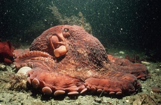 北太平洋巨型章鱼是一种体型非常大的章鱼,也叫巨人章鱼,目前仍旧保持着世界吉尼斯纪录的是,一只周长9.1米,重达272公斤的北太平洋巨型章鱼。它们十分聪明,甚至可以模仿人类开瓶盖。懂得如何伪装自己,以便于捕食。