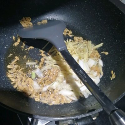 3、起锅烧油,放虾皮,(有条件的可以放虾仁),加葱姜蒜爆香。