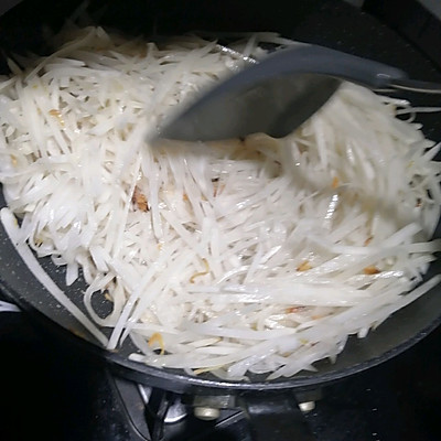 4、放入萝卜丝继续大火翻炒至断生(这一步很重要可以去掉萝卜的辛辣气)!