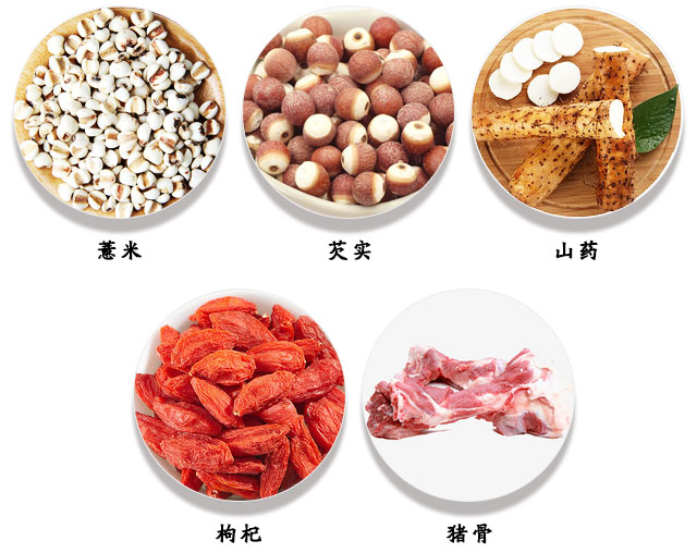 过程:(1)芡实洗净后先浸泡一小时左右,薏米半小时左右;山药去皮泡水;(2)猪骨洗净去除汤面泡沫;(3)将之前浸泡的薏米、芡实用大火高压锅半小时后转小火再压20分钟左右;(4)开锅释压后加入枸杞与山药,再用中火压十多分钟即可。
