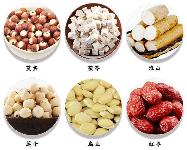食材:芡实、茯苓、淮山、莲子、扁豆各25克-30克左右;红枣3-5枚,生姜、葱、海带适量;猪脊骨500克左右;