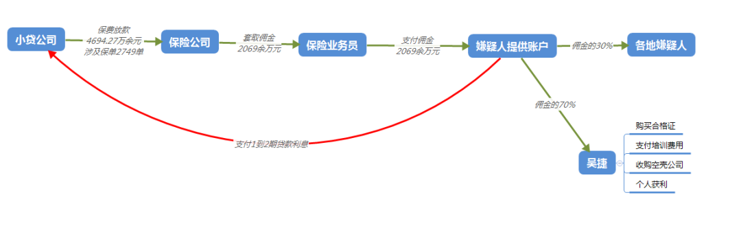 2020年5月至7月期间,云南某汽车销售服务公司主要负责人吴某等5人,在明知没有真实车辆所有权及使用权的情况下,以购买包装的多家汽车相关业务公司为被保险人,使用非法渠道购买而来的虚假汽车合格证复印件向省内两家保险公司购买汽车商业保险,并由多家省外小贷公司作为投保人(出资方)代其支付保费。投保完成后,共骗得两家保险公司保费返点1901万元。