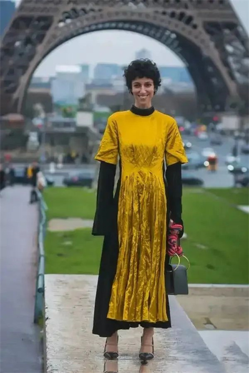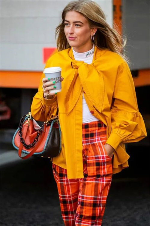 成语【橙黄橘绿】迎面而来,把这身精心装扮的色彩都囊括其中,连所指的季节感也表现出来了。