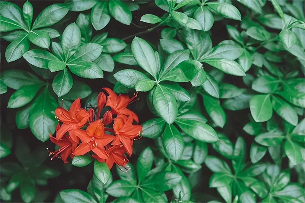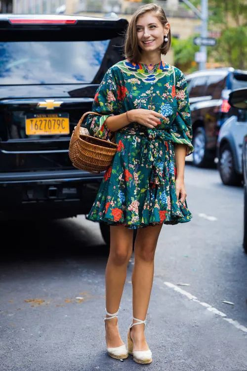 这一身碎花裙以深暗的墨绿色作为底色,整体明度很低,虽印花中有红有绿有蓝有粉,但几朵稀稀零零的红花最为突显,既因为红色本身的艳度高,也因为和绿色是强对比,所以就有了这【绿暗红稀】的搭配感。