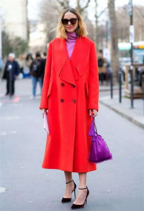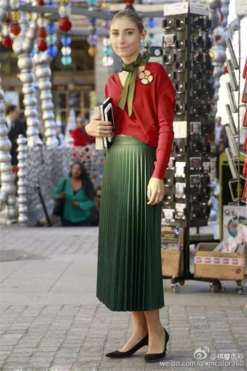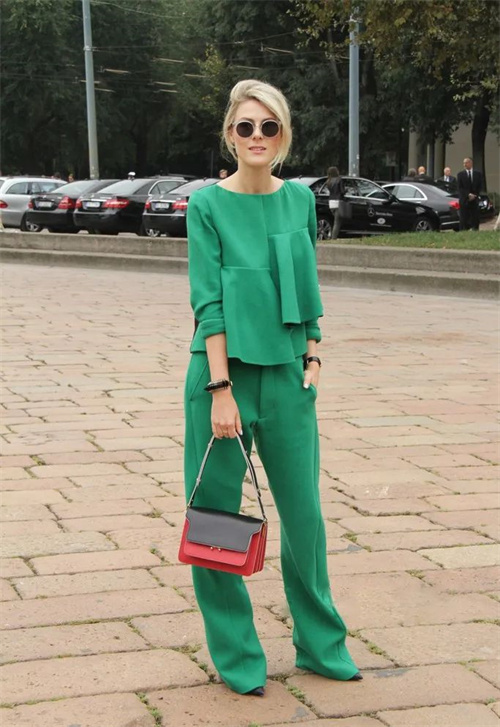一身饱满的大面积的绿色套装,用小面积的带红色的包做单重点配色,同时也是对比配色。从色彩比例来看,绿色很多,红色很少,用【绿肥红瘦】来形容也是很形象了。