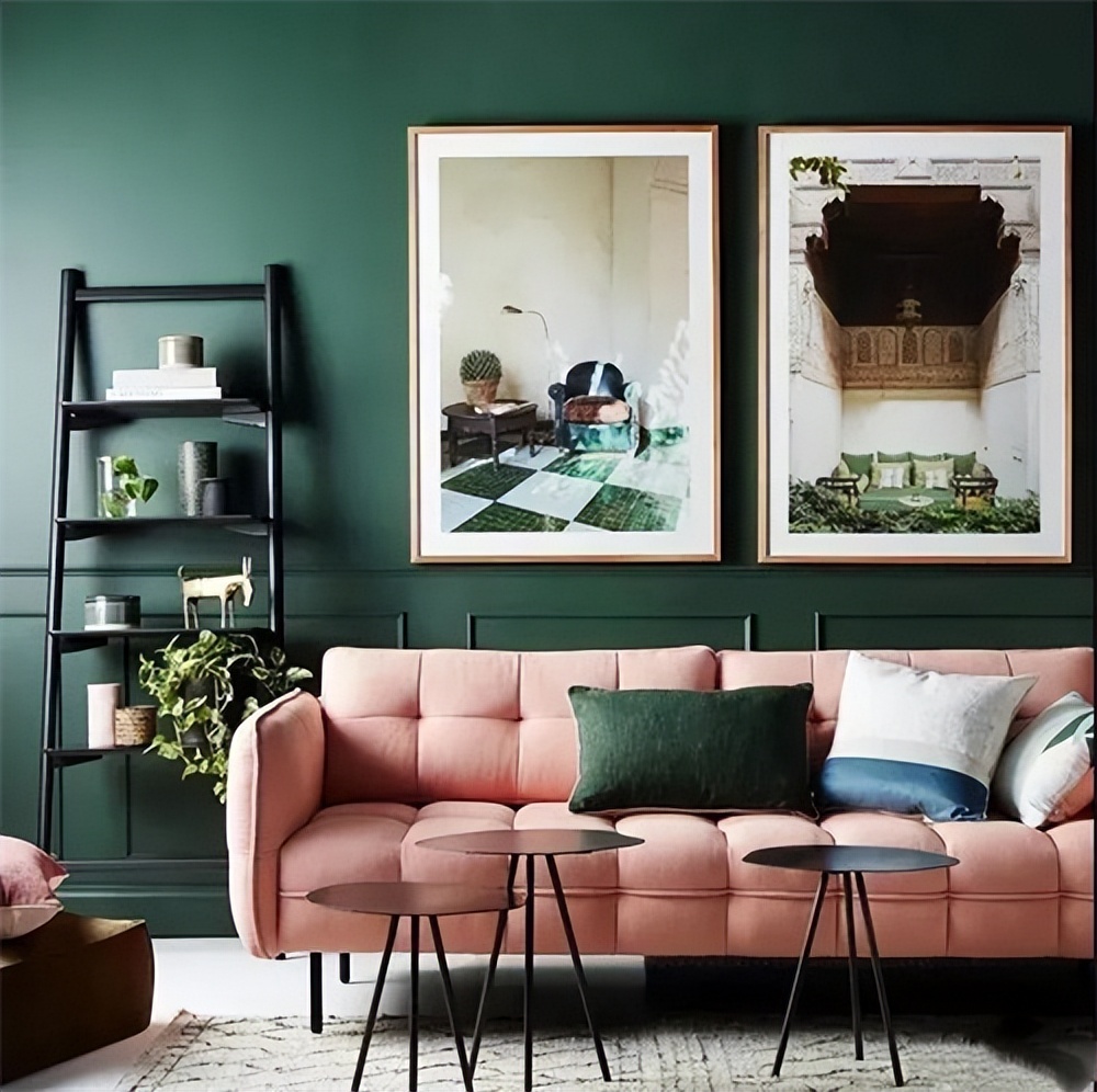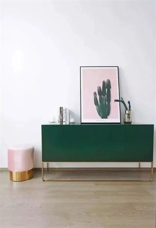这种以轻浅的粉色白+深重的墨绿色的搭配效果,也是时下蛮流行的家居配色方案。