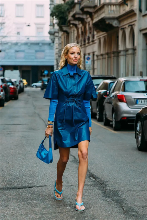 除了用银色作色调配色,从服装、配饰到妆容,都以蓝色作为高度统一的同色系配色,这种配色方法很适合大家日常穿搭运用,既高级又显丰富层次。而这种蓝色的渐变感多像那个用得极多的成语【青出于蓝而胜于蓝】。