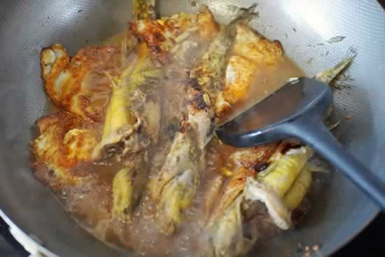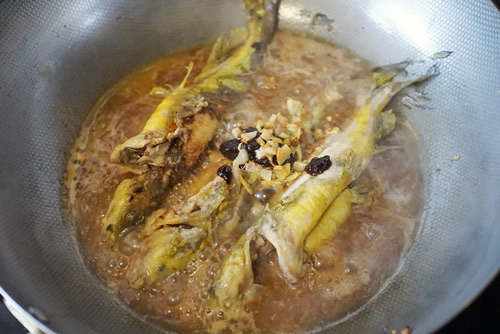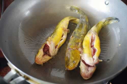 5、 利用锅里的余油放入洗净的黄骨鱼煎;