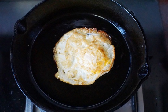 3、 然后煎好鸡蛋,再把煎好的鸡蛋用铲子对半切开,捞起备用;
