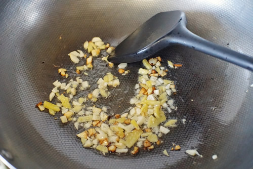 4、 热锅后锅里倒入胡姬花古法花生油,放入蒜末、姜末煸出香味,然后盛出备用;