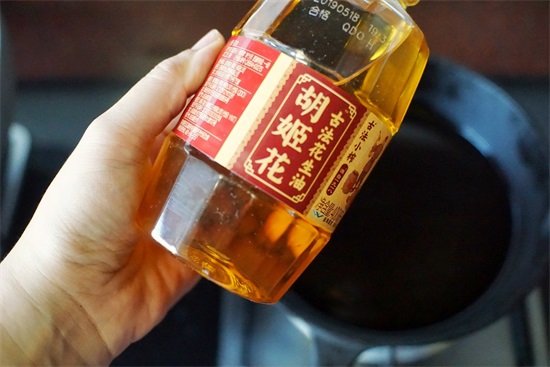 2、 热锅后倒入胡姬花古法花生油;