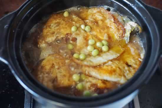 8、 将所有的材料转入砂锅中,放入豌豆粒一起烧开后转小火焖8分钟;