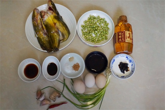 食材:黄骨鱼3条,鸡蛋3个,蒜头3瓣,姜1块,豆瓣酱1勺,生抽10ml,陈醋10ml,盐4g,鸡精3g,白胡椒粉1g,料酒10ml,葱1根,干红辣椒1个,豌豆粒50g,胡姬花古法花生油30ml,开水适量