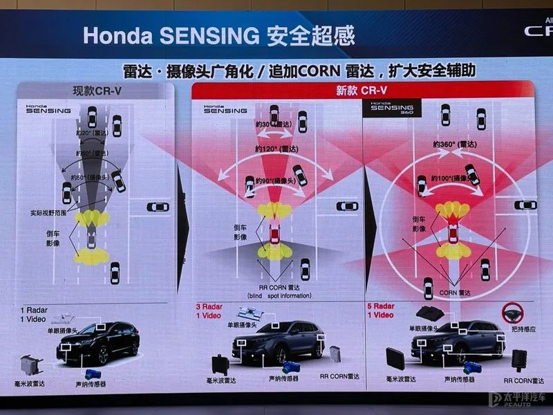 除此之外,在驾驶配置方面,新车还首次搭载了多项新配置,包括陡坡缓降以及智能驾驶辅助HondaSENSING 360等配置。Honda SENSING 360之所以多了360,是因为在硬件方面,新车也多了两个毫米波雷达,从而实现360度的感知覆盖。