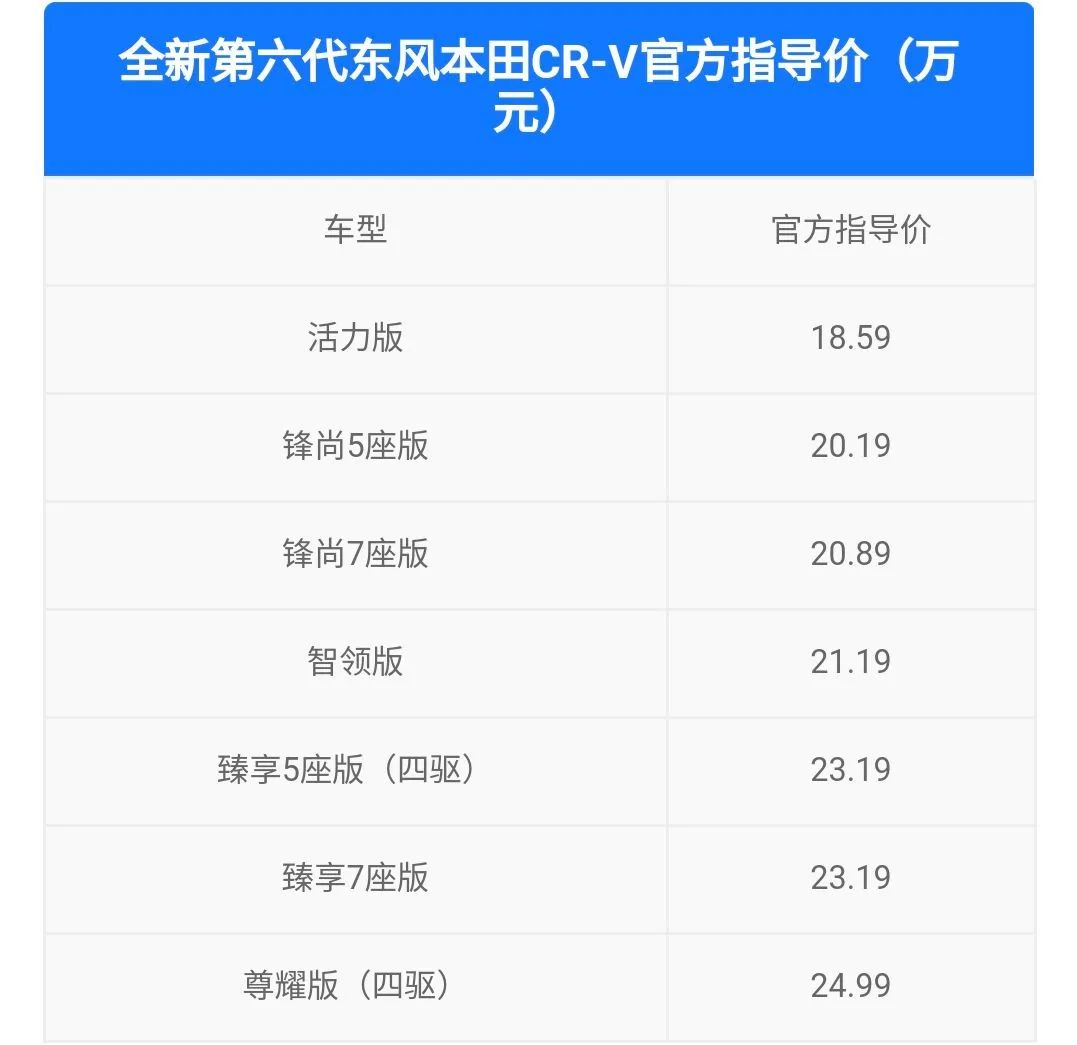 2022年9月28日晚,东风本田新一代CR-V正式上市,新车共推出7款车型,官方指导价格为18.59-24.99万元,其中赤焰红、晶耀白价格需另付定制费用。作为全新的第六代CR-V,新车无论是外观、内饰、车身尺寸等诸多方面进行了全面升级,而在配置、发动机和智能驾驶辅助方面,新车也有了不错的提升。此次上市的新车仅为燃油版,而插电式混合动力e:PHEV车型,将在明年一季度发布。e:HEV非插电式混合动力车型,将会在明年二季度发布。