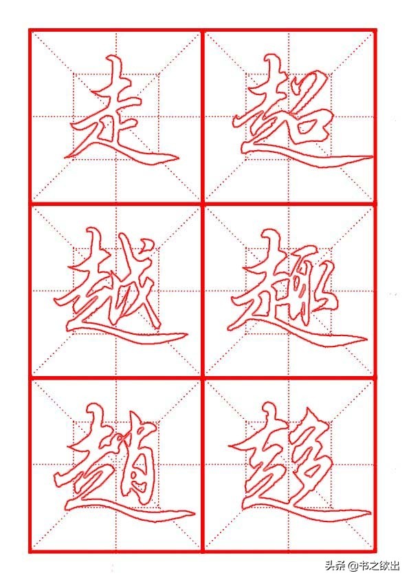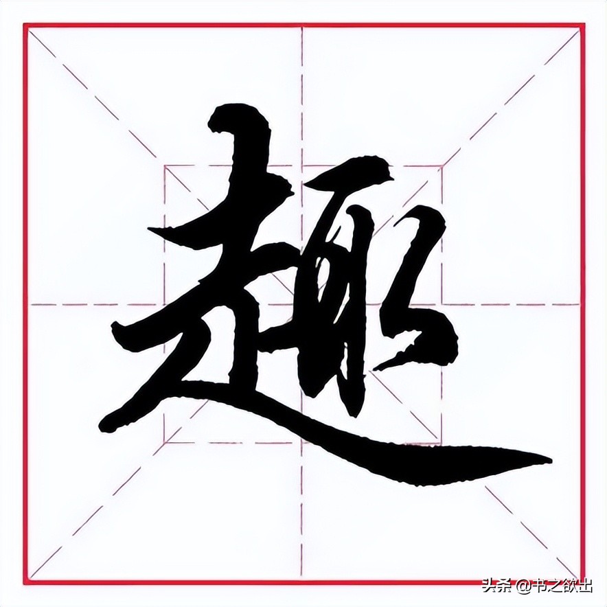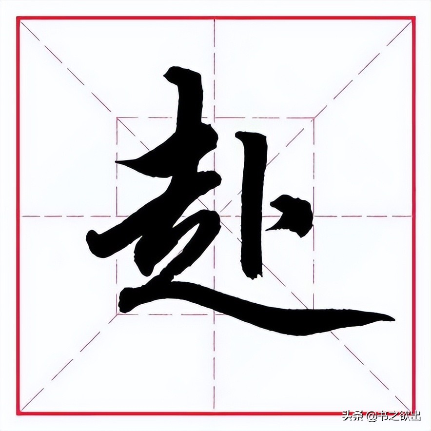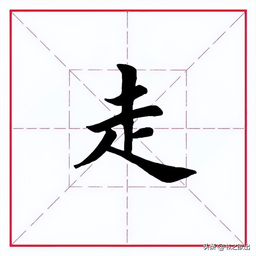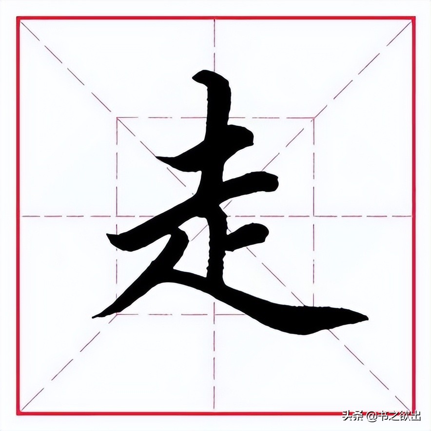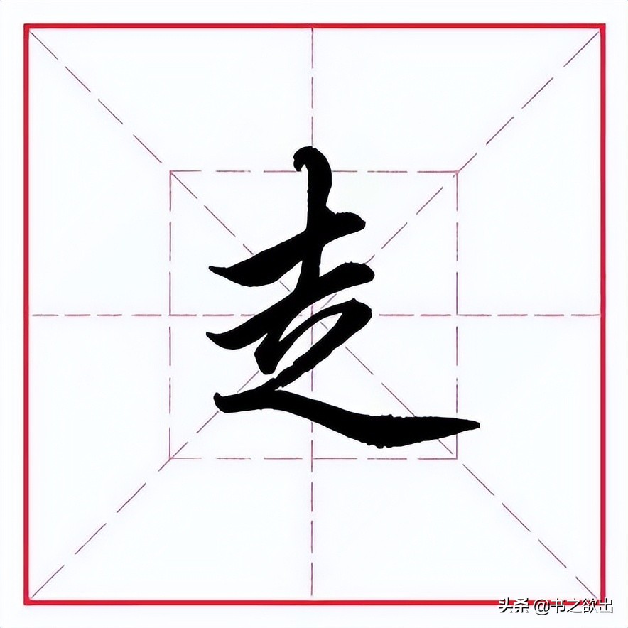 行书中走字旁书写时更加流畅连贯,其多作为偏旁居于字左,在字中呈半包结构。捺笔起承托作用,势平,舒展流放,其刀锋的起笔为关键。起笔过早平捺就会显短,不能有力地托载上方;起笔过晚则显长,从而与上部失去协调。