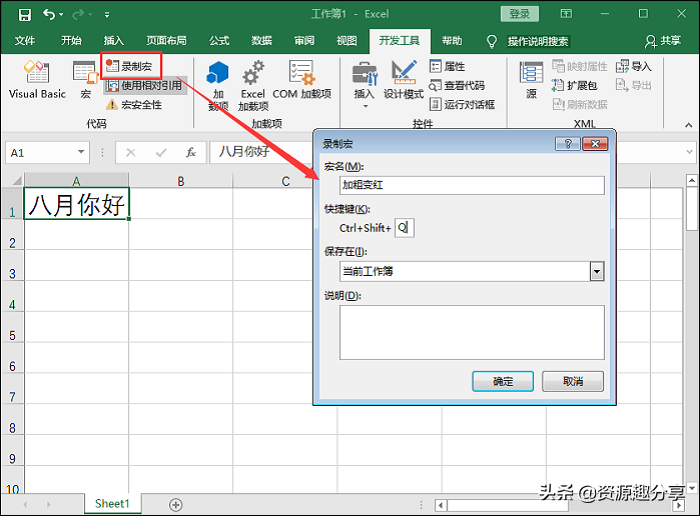 2、在“开发工具”界面中选中单元格A1,点击“录制宏”。然后设置:“宏名为加粗变红,快捷键为Ctrl +Shift +R”,然后点击“确定”就可以了。