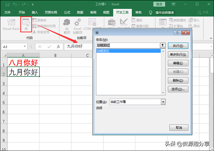 4、接着我们可以设置单元格A2。选中单元格A2,然后点击“开发工具”界面中的“宏”,然后点击弹出页面中的“执行”就可以了。我们也可以选中单元格A2直接按住快捷键“Ctrl +Shift +R”就可以了。