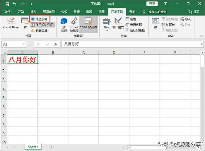 3、接着在开始界面中,将单元格A1的内容加粗、填充为红色。然后点击“开发工具”中的“停止录制”就可以了。