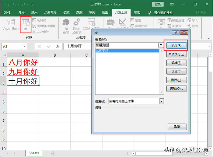2、在Excel中打开工作簿,选中单元格A3。然后点击“开发工具”界面中的“宏”。接着在弹出界面中点击“执行”就可以了。