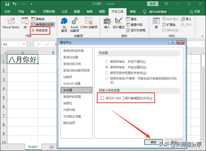 1、在“开发工具”页面中,点击“宏安全性”,然后在“信任中心”界面中将“开发人员宏设置”设置为“信任对VBA工程对象模型的访问”。