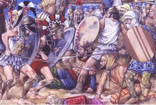 将军们把全体人民组织起来,甚至把奴隶也编入了军队并推选米太亚为总司令。9月12日,雅典以1万多名军士及1000名普拉提亚援军,面对几倍于自己的波斯军,毫无惧色。米太亚将军对战士们说:“雅典是戴上奴隶的枷锁,还是永葆自由,关键就在于你们身上!”这话语激励了战士们的心,鼓舞了他们的斗志,两军在马拉松平原展开了决战。米太亚指挥军队占领了马拉松山坡高地,利用有利的地形,采取两翼包围的战术,变劣势为优势,以少胜多,打得波斯军大败,取得了胜利。