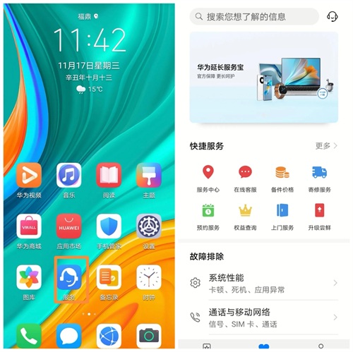 6.华为服务功能 在桌面打开服务APP 手机售后地址-维修价格-客服热线-手机自检等功能。