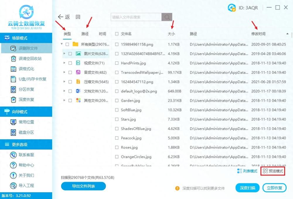 步骤2:在扫描完成后,软件提供了灵活的筛选方式,你可以根据文件类型、大小、路径、修改时间等方式缩小查找范围,并预览找到的文件。