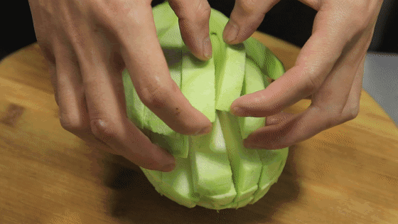 1.首先,我们准备一下食材:青茄子一个把外皮削干净先横刀切,再竖刀把茄子切成条,茄子顶部尽量不要切断。
