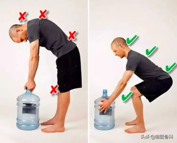 需要弯腰抬重物时,记得利用硬举或深蹲的姿势,保持背部直立,弯曲膝盖,把重物靠近身体后再抬起,来避免下背拉伤。