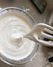 奶油打发至顺滑,能拉出坚挺不能动的三角尖,倒过来也不会掉出来的哦。就是硬性状态,做戚风蛋糕合适