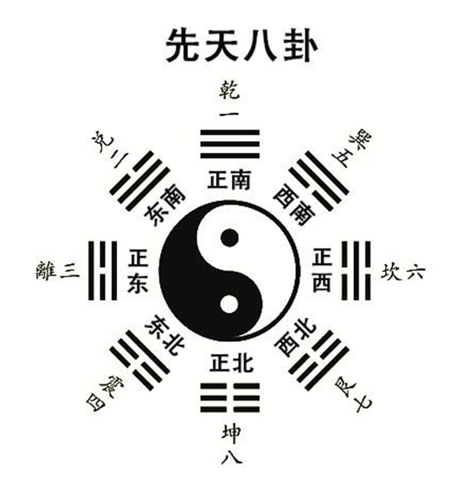 传说中,依河图之象,伏羲通神明之德以画八卦:正南纯阳方位画乾,正北纯阴方位画坤,正东画离象阳中有阴,正西画坎象阴中有阳。四正既定,再配以四偶。东北阳生阴下画震,西南阴生阳下画巽,观阳长阴消画兑于东南,观阴盛阳微画艮于西北。阴阳由微至著,先天循环无端,内含生生之机,此皆混元一气之妙用,太极主宰之神功。