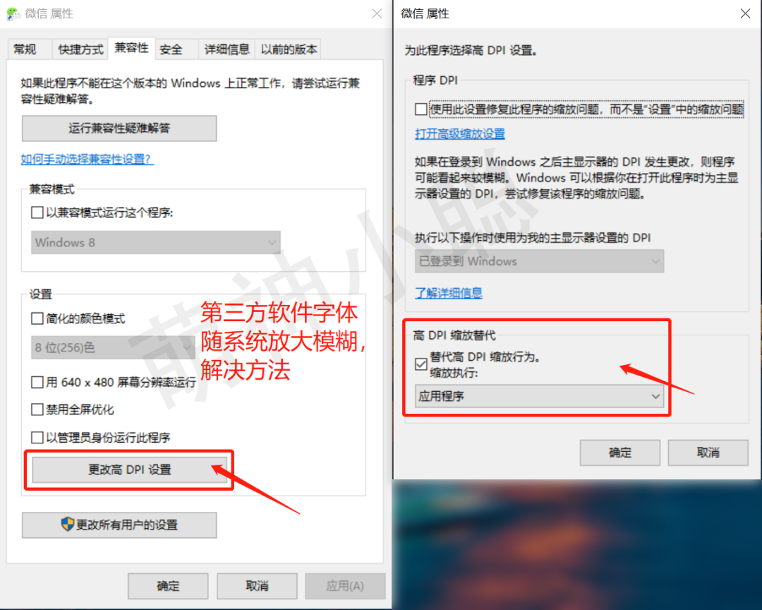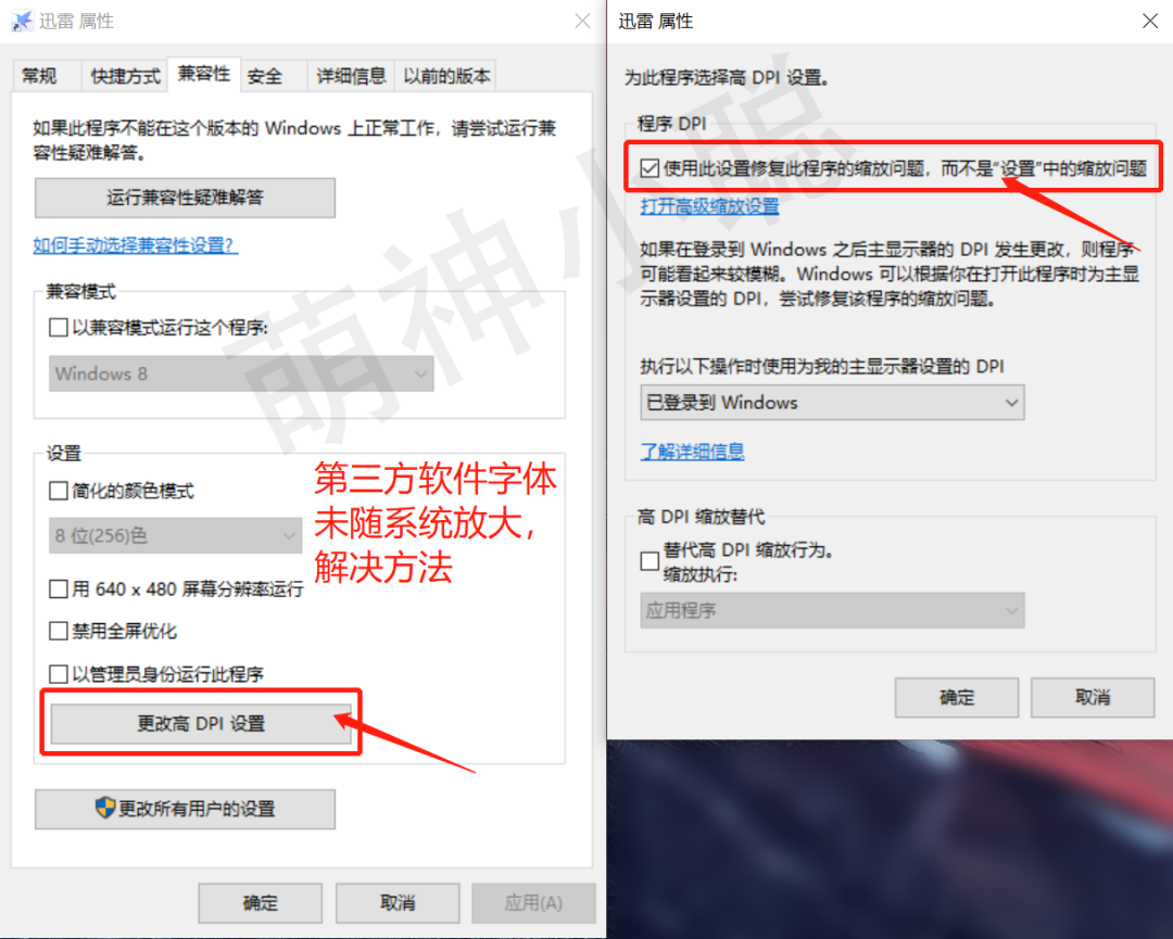 右击第三方软件,点击“属性”–“兼容性”–“更改高DPI设置”,