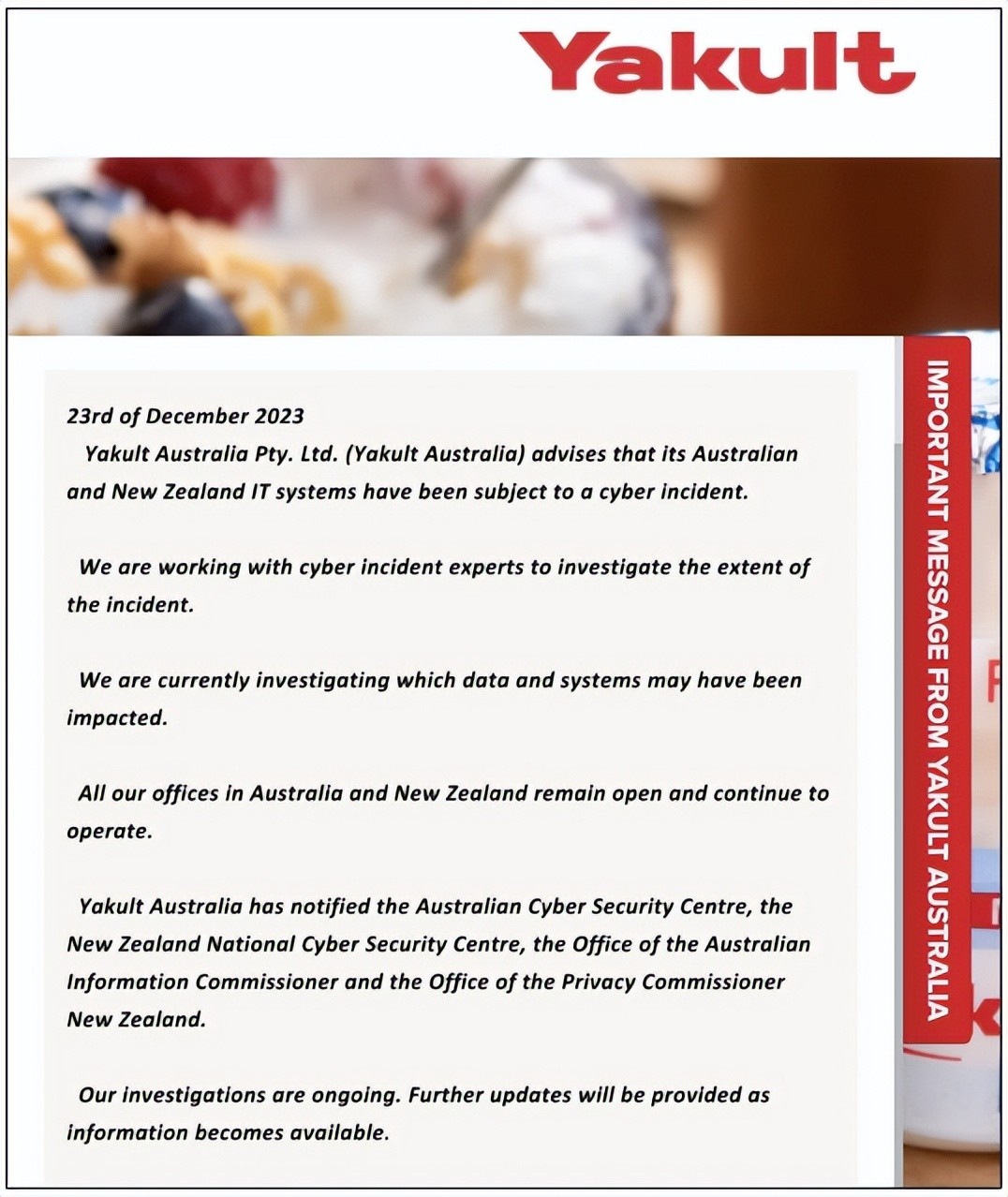 https://www.bleepingcomputer.com/news/security/yakult-australia-confirms-cyber-incident-after-95-gb-data-leak/
