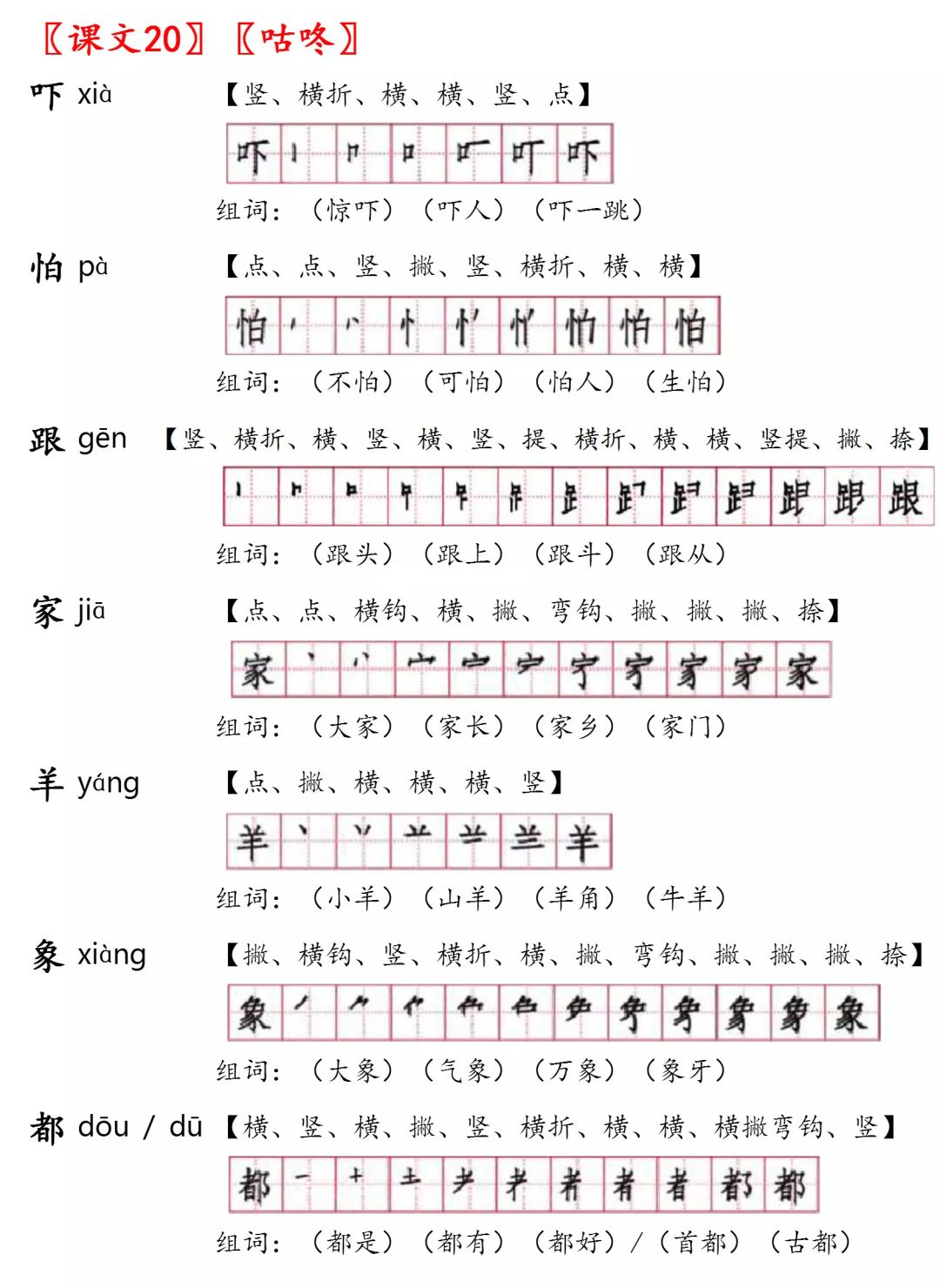 20 吓 xià 怕 pà 跟 ɡēn 家 jiā 羊 yánɡ 象 xiànɡ 都 dōu