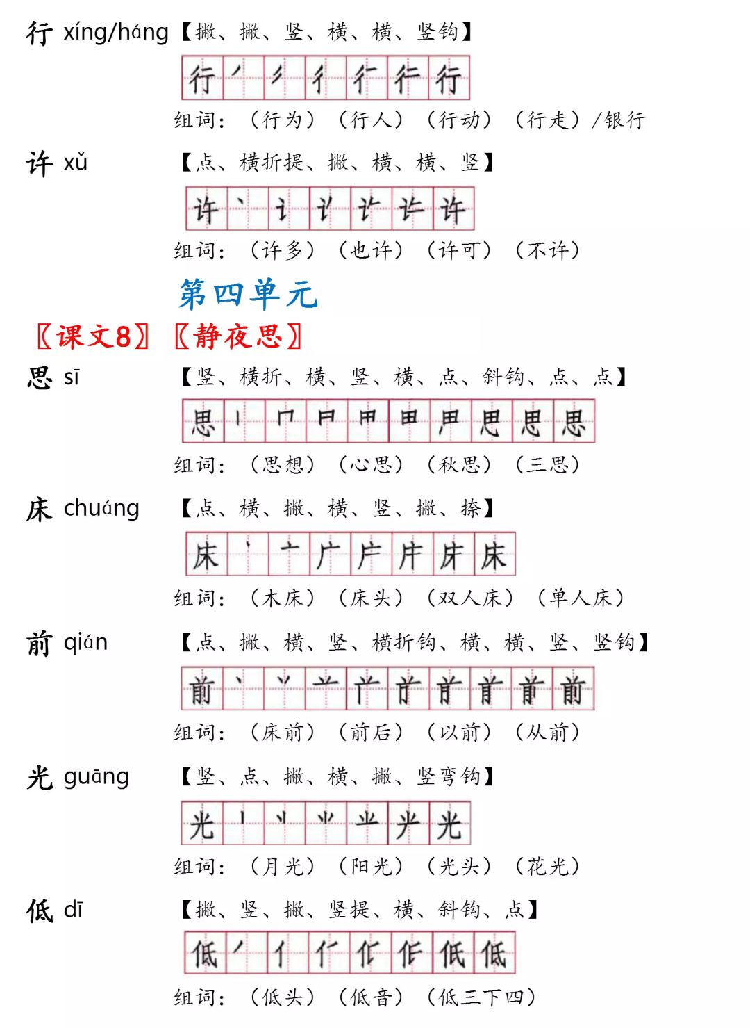 8 思 sī 床 chuánɡ 前 qián 光 ɡuānɡ 低 dī 故 ɡù 乡 xiānɡ