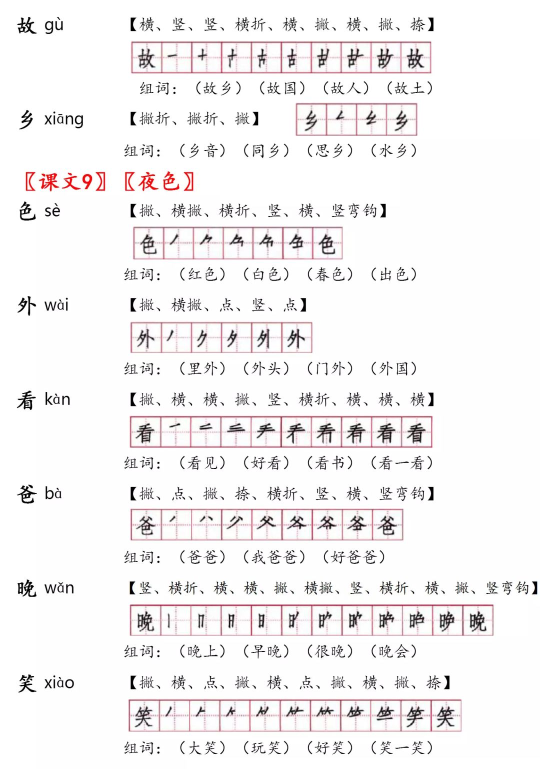 9 色 sè 外 wài 看 kàn 爸 bà 晚 wǎn 笑 xiào 再 zài