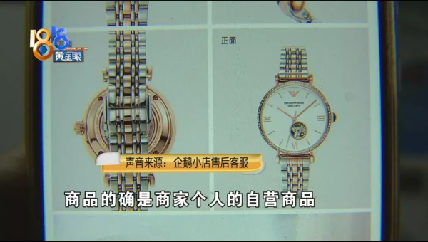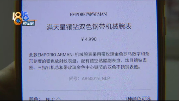 王女士说,母亲在直播中跳转到主播的企鹅小店平台,买了这款阿玛尼满天星手表,价格是2499块钱。阿玛尼官方网站上这款手表的价格是4999块钱。王女士说,她看了手表,觉得有点不对劲。