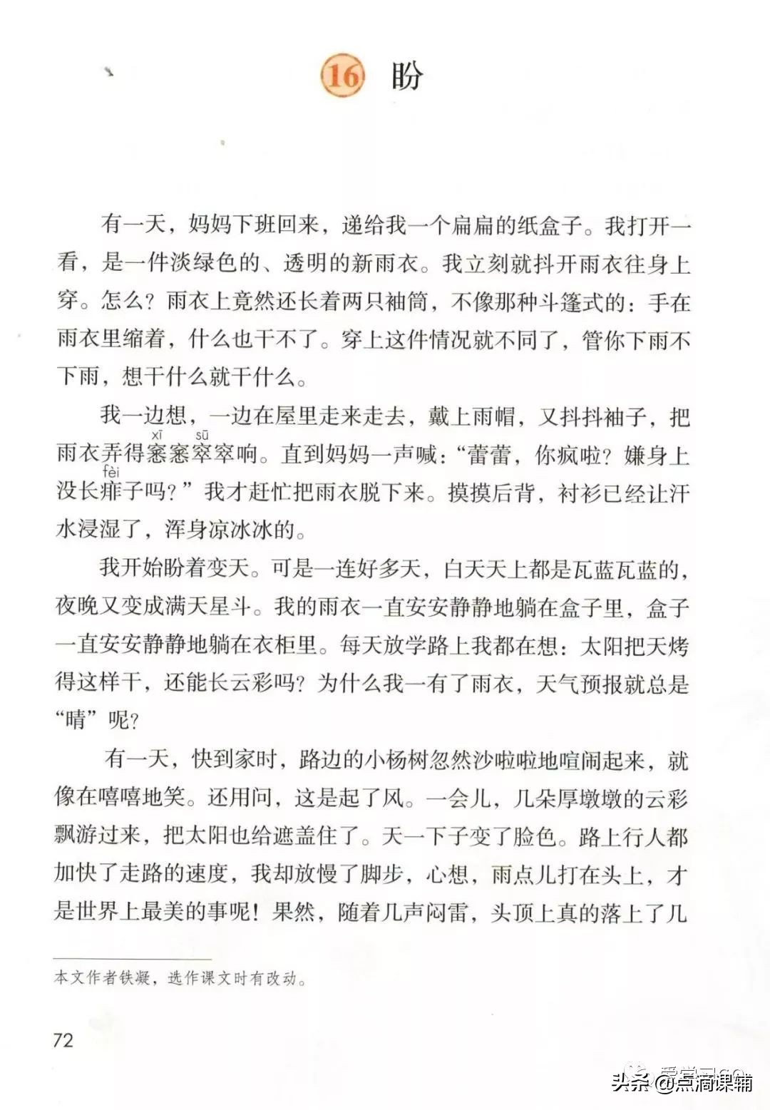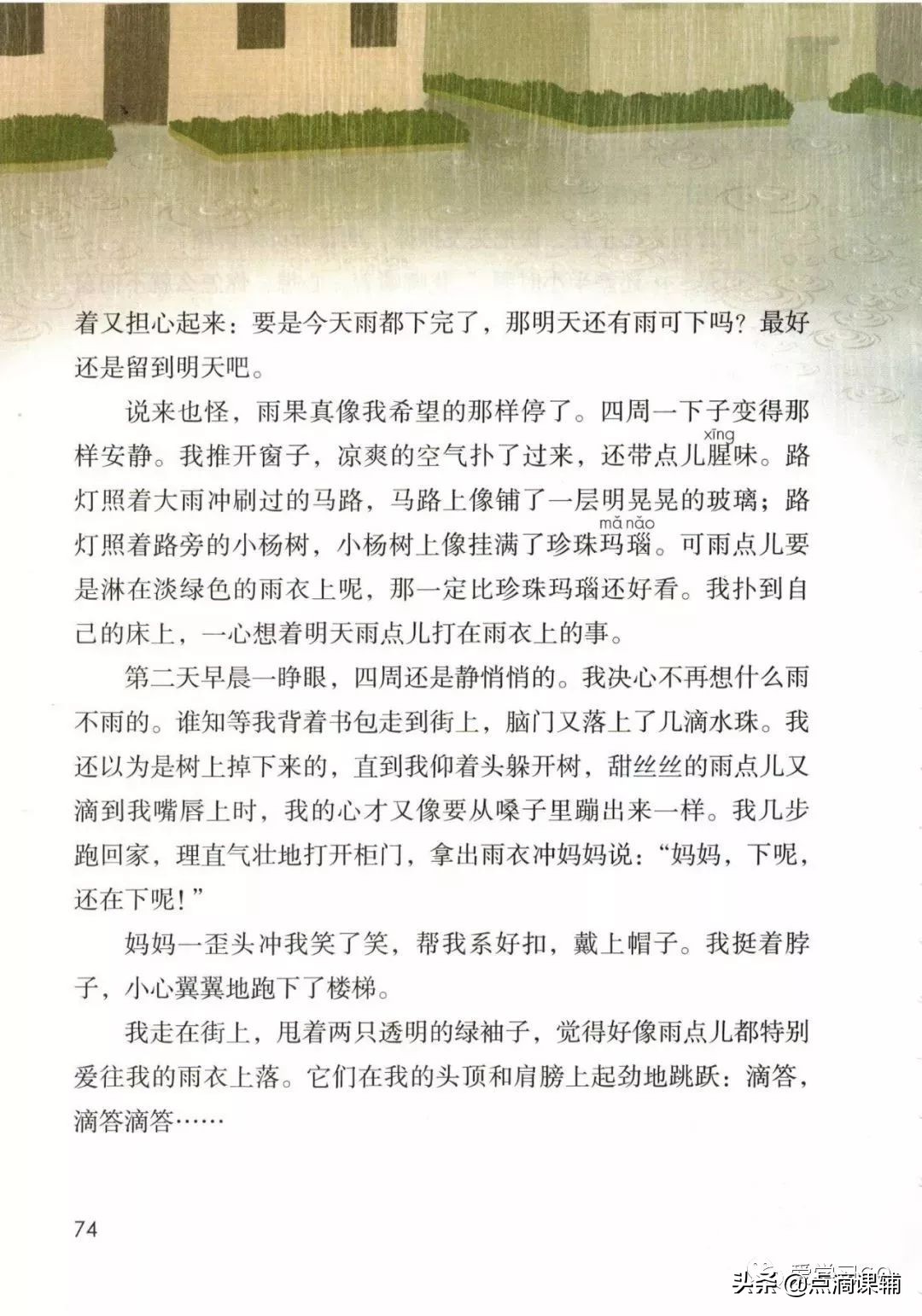 第三部分(16-17):写晚上雨停了,“我”一心想着明天雨点儿打在雨衣上。