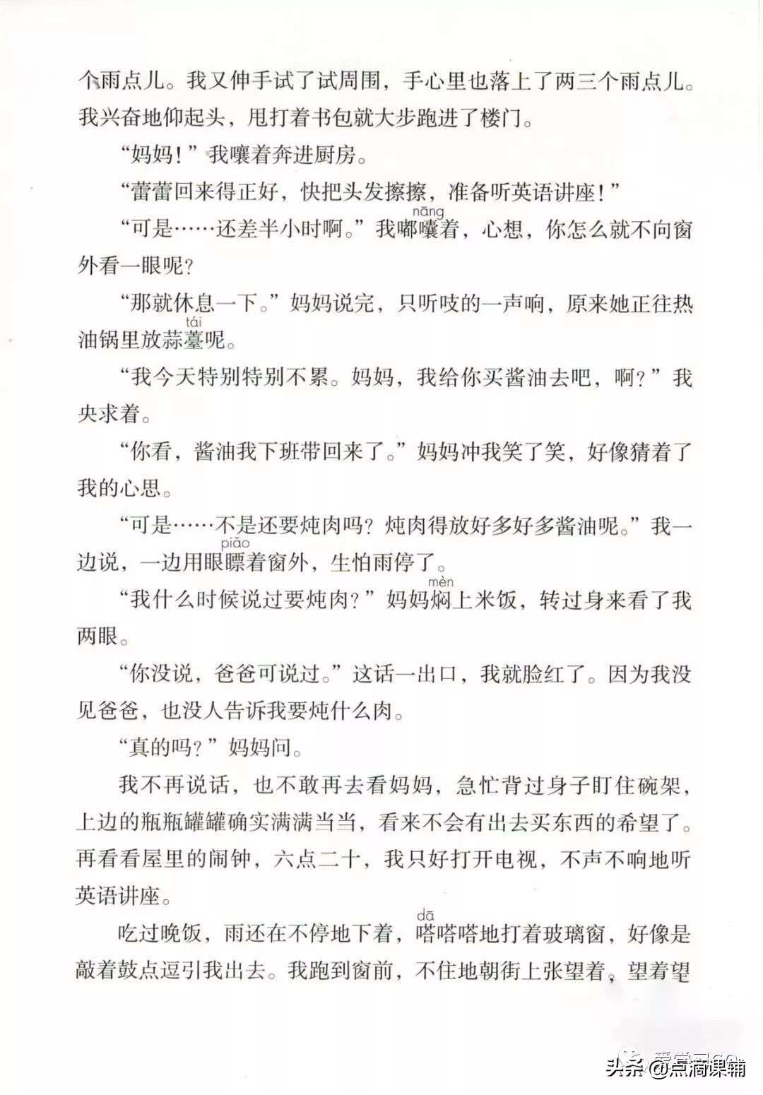 (1)走在放学路上盼着变天。(2)放学回家时天上下了几个雨点儿,盼着出去买酱油。(3)继续寻找借口出门,盼着雨别停。(4)吃过晚饭,没有机会出门,怕雨下完了明天就没有雨下了,又盼着雨停。