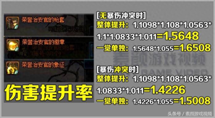 整合各项属性的提升率,可得出荣誉治安官套装为小号所带来的整体伤害提升为: