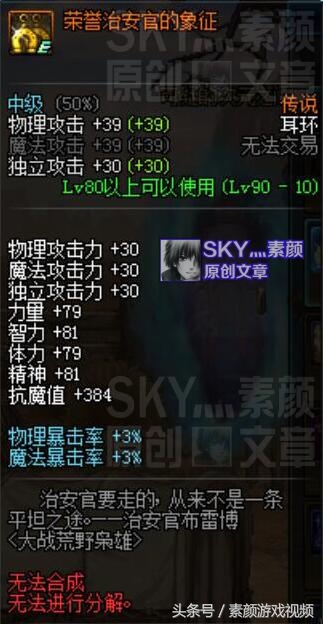 象征(耳环,感觉有点模仿英雄王的象征……)有着80点左右的基础四维加成,可增加30点物理、魔法和独立攻击力(品级调高以后,数值应该会上升至38点左右,这里拿不太准,还是按照30点来计算)。